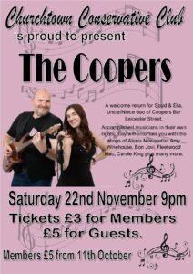 Hello Members and Friends of Churchtown Conservative Club, We are thrilled to announce the return of The Coopers on Saturday 22nd November 2025! Get ready for a fantastic evening with the talented Spud and Ella Cooper. Spud & Ella are a unique uncle-and-niece duo, well-known across Southport for both their music and their venues — […]