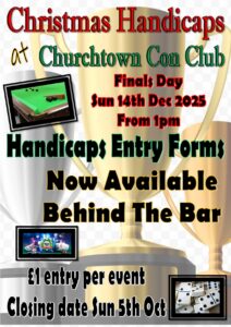Christmas Handicaps – Snooker, Table Bowls, Darts, Dominoes & Poker Hello Members of Churchtown Conservative Club, We’re pleased to announce that entry forms for this year’s Christmas Handicaps are now available behind the bar! Entry Fee: £1 per person / £2 per doubles event Eligibility: Members only (sorry, no guests, but them may come to […]
