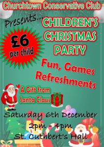 ✨ Children’s Christmas Party 2025! Dear Members and Friends of Churchtown Conservative Club, It’s that magical time of year again! Join us for our Children’s Christmas Party at St. Cuthbert’s Church Hall on Saturday, 6th December 2025, from 2pm to 4pm. ️ Tickets are just £6 per child — available from the Club during opening […]
