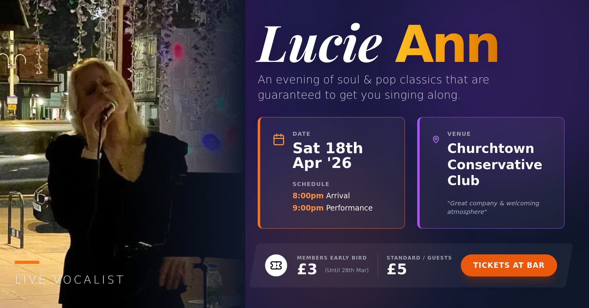 Live Music at Churchtown Conservative Club We’re delighted to welcome Lucie Ann to the Club on Saturday 18th April 2026 for an evening of fantastic live music. Lucie Ann is a versatile and experienced vocalist, performing a wide variety of soul and pop classics that are guaranteed to get you singing along and set the […]