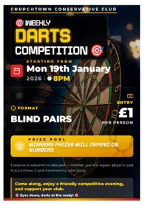 Weekly Darts Competition Churchtown Conservative Club After a good turnout this week our Weekly Darts Competition continues on: Tuesday 3rd February 2026 (Note: this has been moved from Monday) Start Time: 8:00pm Format: Blind Pairs Entry: £1 per person Prizes: Winners’ prizes will depend on numbers — but you have to be in it to win it! How […]