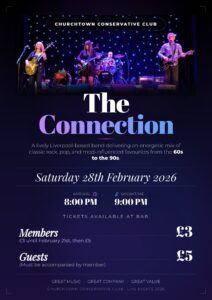 LIVE MUSIC AT CHURCHTOWN CONSERVATIVE CLUB We’re delighted to welcome The Connection, a lively Liverpool-based band, to Churchtown Conservative Club for a fantastic night of live music on Saturday 28th February 2026. About The Band – The ConnectionThe Connection are known for their energetic live performances and a great mix of well-loved songs spanning the […]