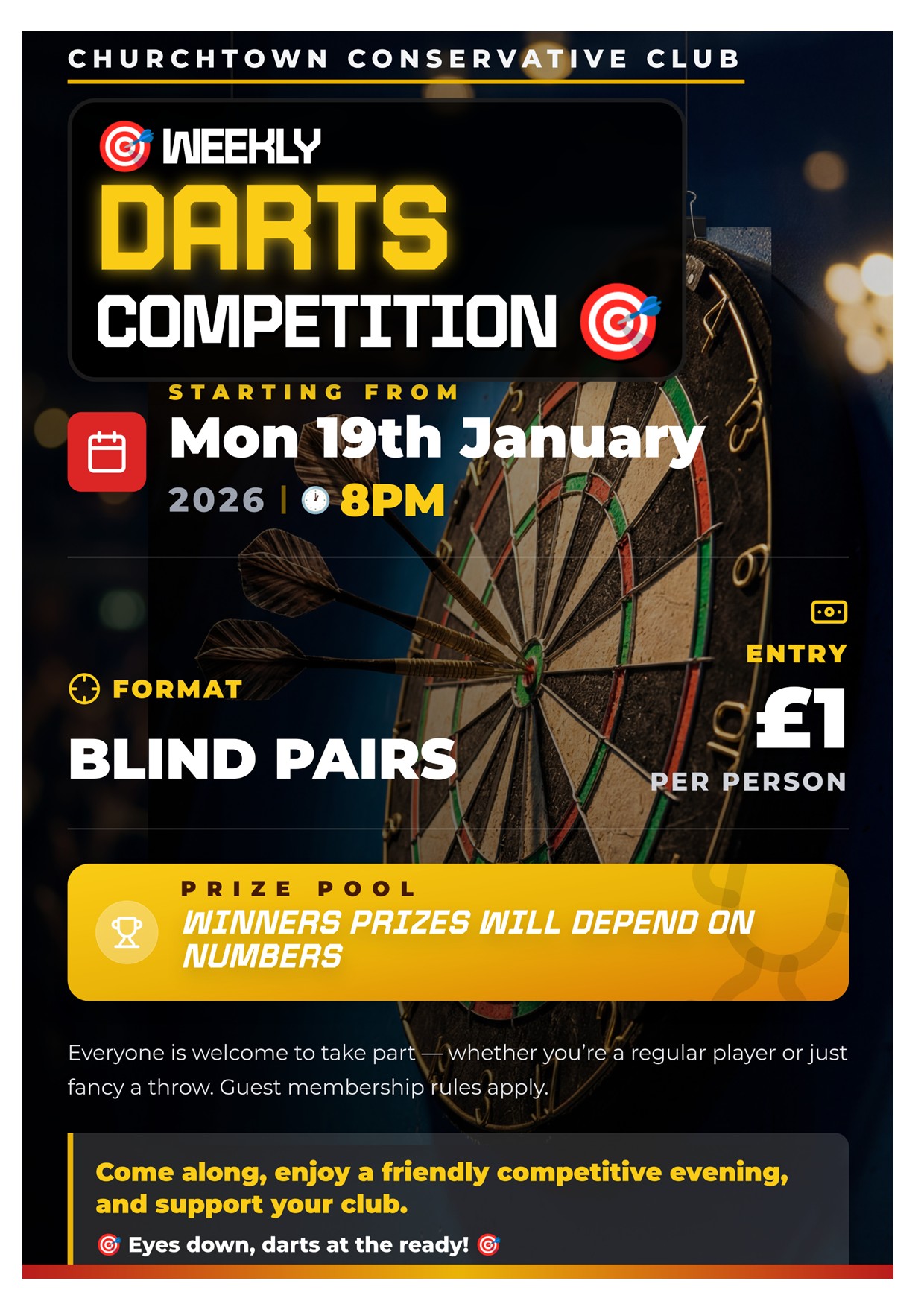 Weekly Darts Competition from 8pm Tuesday 3rd February 2026