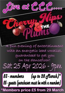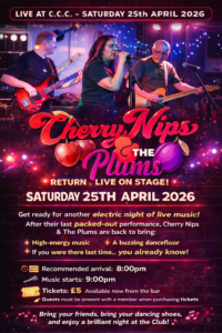 LIVE AT C.C.C. – SATURDAY 25th APRIL 2026 Hello Members and Friends of Churchtown Conservative Club! We’re delighted to announce the return of the fantastic Cherry Nips & The Plums on Saturday 25th April 2026 — and if you joined us last time, you’ll know this is a night not to be missed! Their previous […]