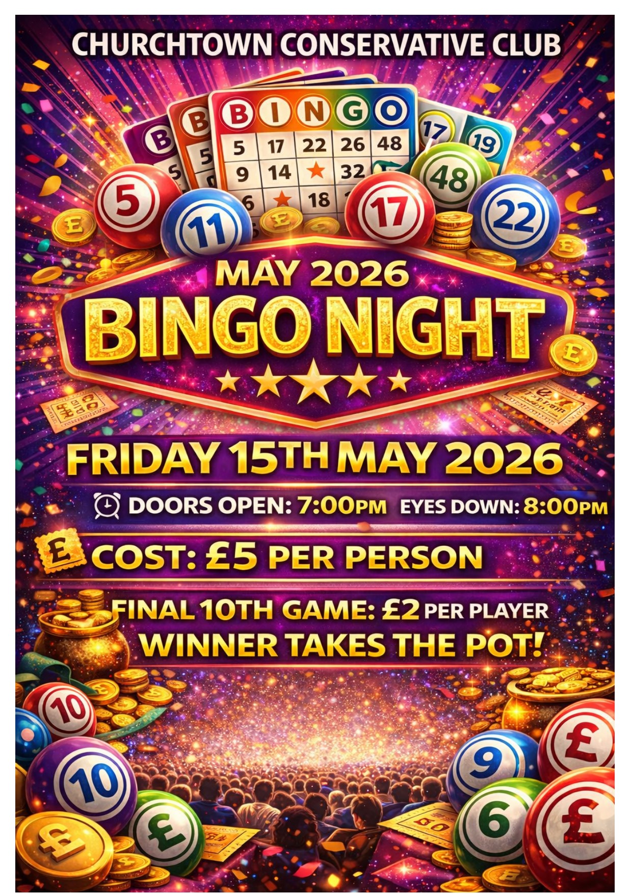 🎉 May 2026 Bingo Night at Churchtown Conservative Club! 🎉 Hello members and friends of Churchtown Conservative Club! Join us for a fun-filled evening at our April Bingo Night on Friday 17th April 2026.